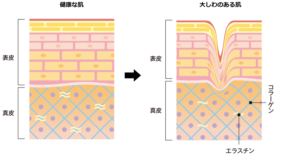 顔面で豊かな感情表現ができるのは表情筋が伸縮し、目や口、頬を動かすためですが、眉間、額、目尻、頬には深くしわとなって刻みこまれてしまいます。しわの出来やすさは大きな個人差があります。また、しわの深さは骨格の違いによる個人差に加えて、様々な要因が関係していると言われています。日々浴びている日光による紫外線の影響も少なくありません。 しわの主な原因は、加齢によるコラーゲンやエラスチンの減少、乾燥、紫外線によるダメージ、そして表情のクセです。加齢で肌の弾力が低下し、乾燥や紫外線がそれを助長します。表情を繰り返すことで、本来一時的なものが定着して深いしわとなります。